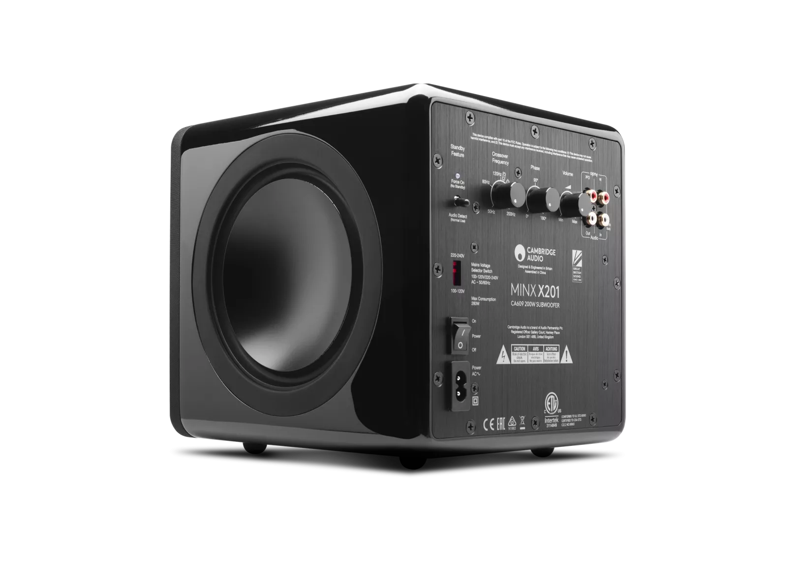 Regler für Lautstärke, Phase und Frequenzweiche ermöglichen perfekte Anpassung an Raum und Lautsprecher.