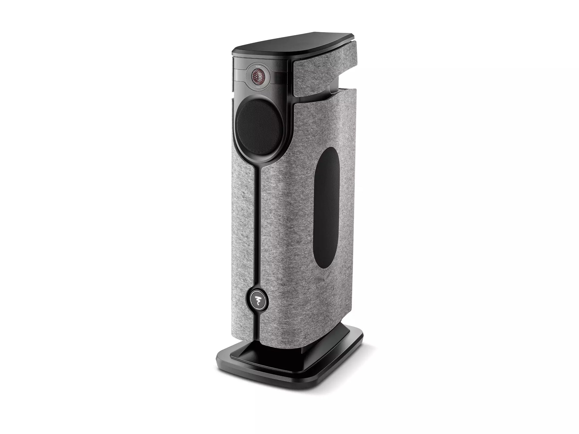 Der massive Sockel aus Aluminiumdruckguss mit integrierten höhenverstellbaren Spikes sorgt für einen sicheren Stand und entkoppelt störende Vibrationen. Die Seitenwände aus grauem Filz bieten nicht nur akustische Vorteile, sondern verleihen dem mattschwarzen Gehäuse eine stilvolle, moderne Optik.